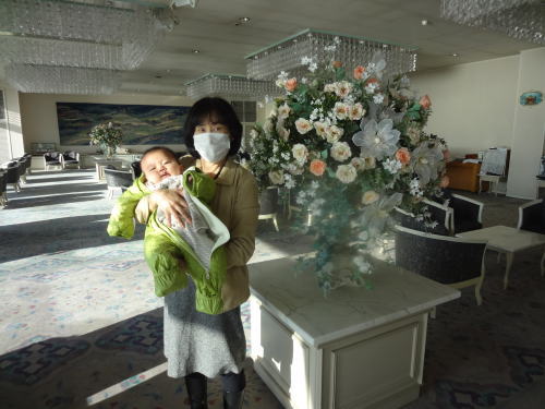 | みかわ温泉 海遊亭ホテル玄関前にて記念撮影 | 1階フロアで優輔君と記念撮影 | |