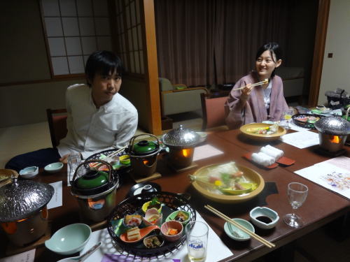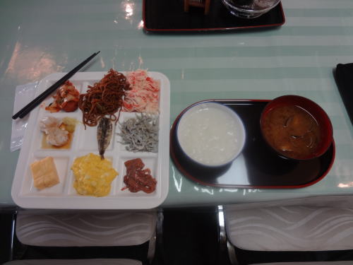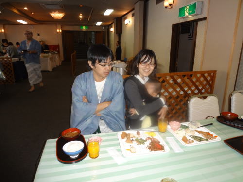 | 海遊亭の朝食 ばいバイキング形式でおかゆとあさりの味噌汁、他 | 顕輔とゆうのさんで、仲も微笑ましく感じました | |