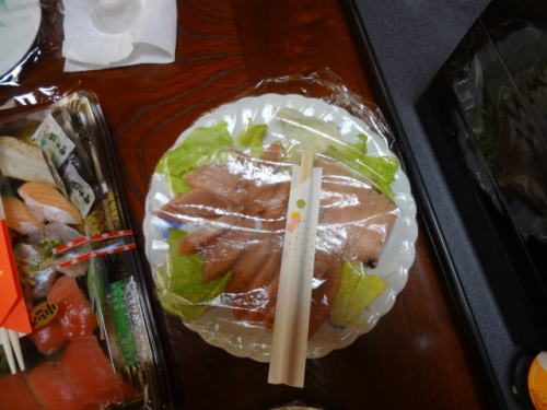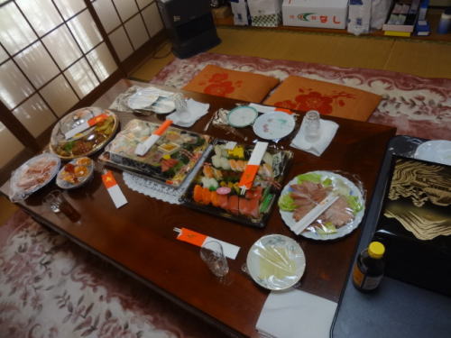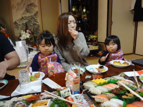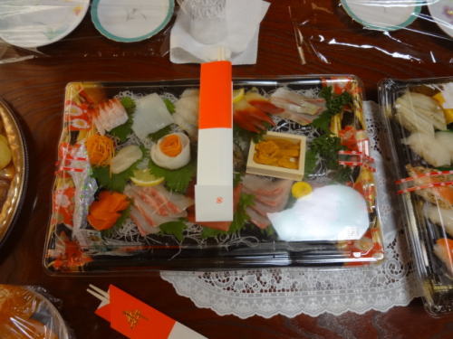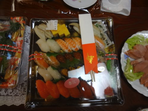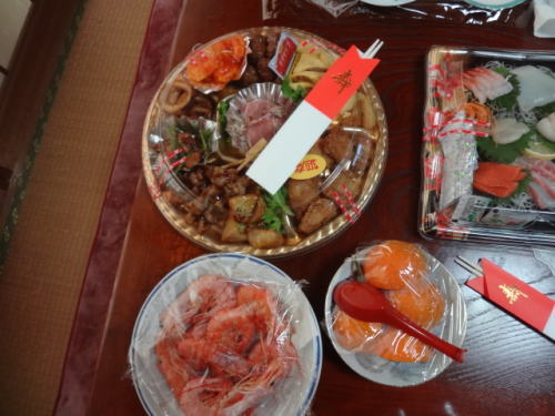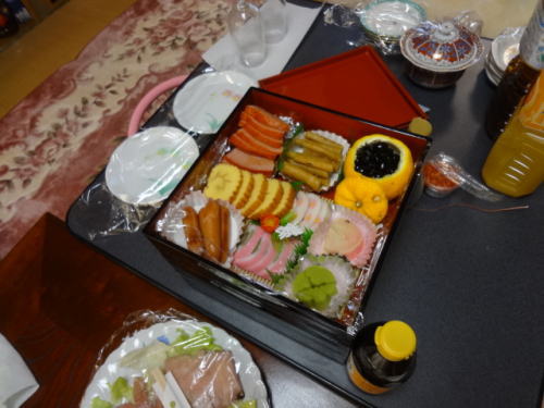 | 正月食事前 料理は鉢盛、刺身、寿司、マグロ大トロ刺身、自家製おせち三段 | 鉢盛とエビ、なまこ | |