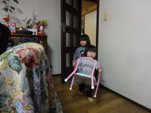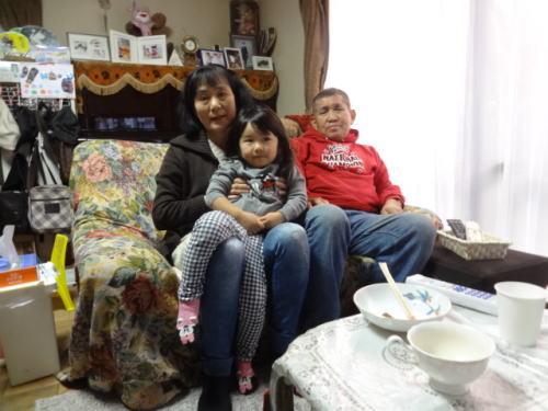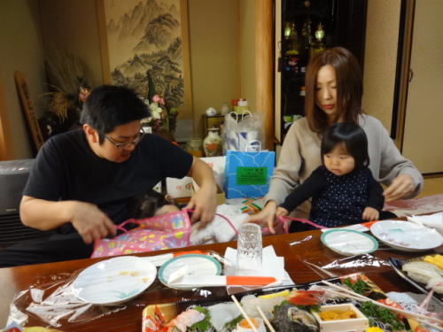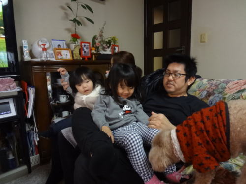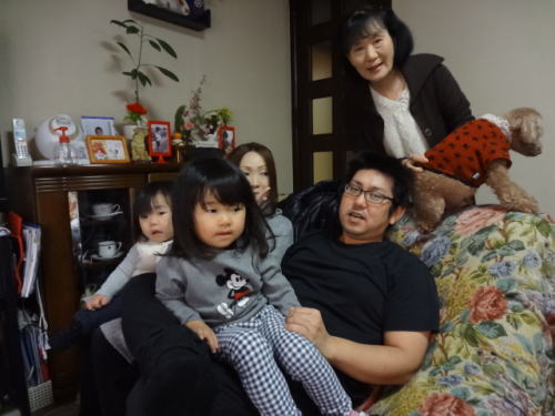 | 心花ちゃんはお父さんに甘えています。トイも仲間に入りたさそうにしています | 達則一家とおばあちゃん、トイもあっちむいて一緒に記念撮影 | |