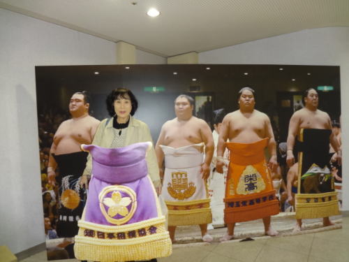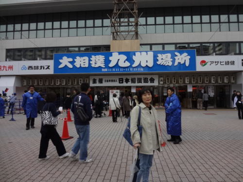 | 九州場所、会場は福岡国際センター。車は歩いて5分ほどのところへ600円/日 | 会場前の”のぼり”。多くの人が会場前や、のぼり前で記念撮影を | |