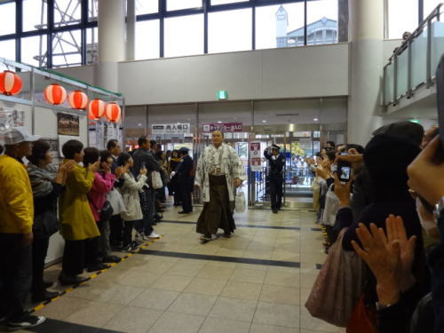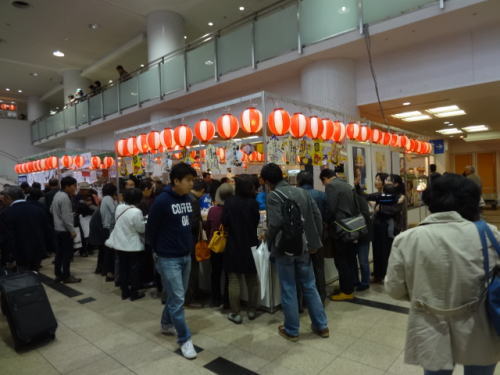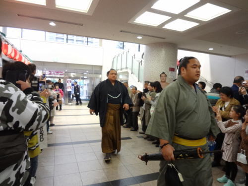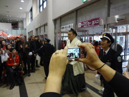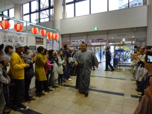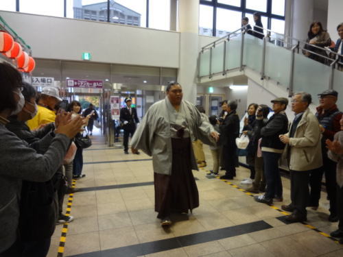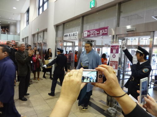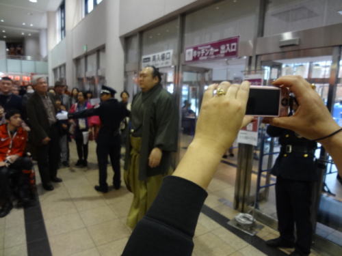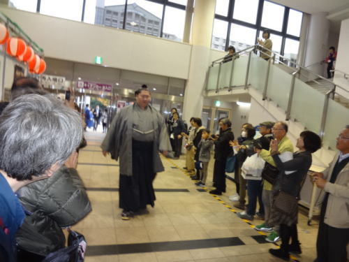 | 会場内1階フロア、売店には多くの人が。私たちも1700円程お土産購入 | 1階フロア。入待ちの人々の中を力士(玉鷲)が入ってくる | |