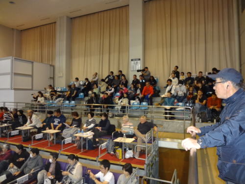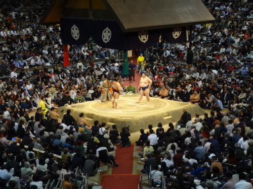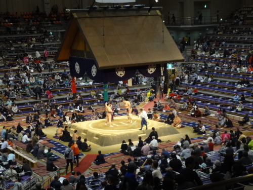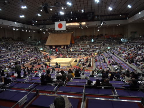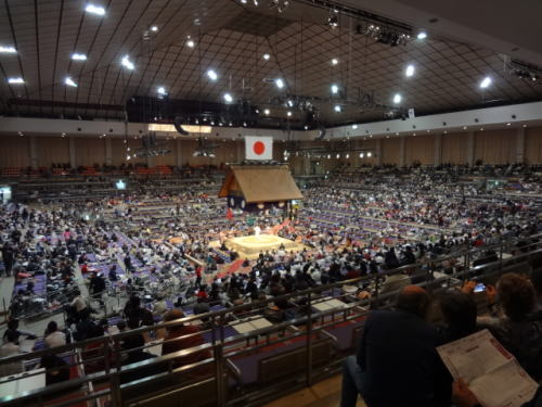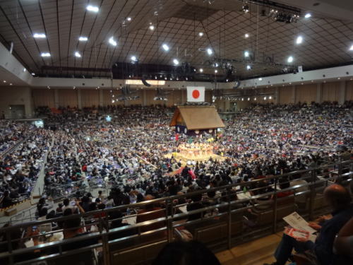 | 幕内後半戦頃になると会場は満員状態。もちろん会場は満員御礼の垂れ幕が | 椅子席C正面方向を眺めたもの、私たちはC3列(後方より2番目)に座っていた | |
