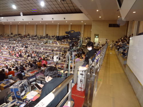 | 十両の取り組みが始まったころ、会場内は半数ぐらいが埋まっている | 正面3階にはNHKのカメラと映像処理が右上方向に解説者が | |