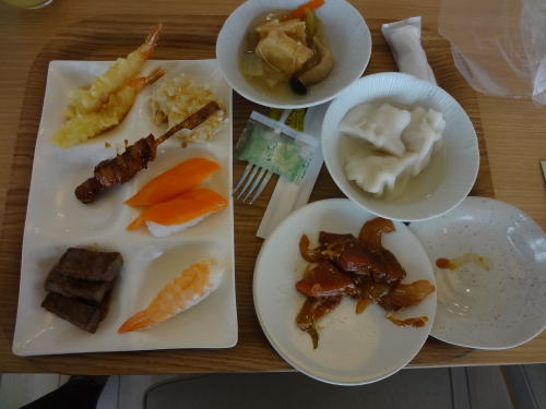 | バイキング料金1人1640円と安い割りに料理の種類も多く大変美味しかった。 | メニューは寿司、天ぷら、ステーキ肉、水餃子、ズケの刺身など豊富で美味しい | |