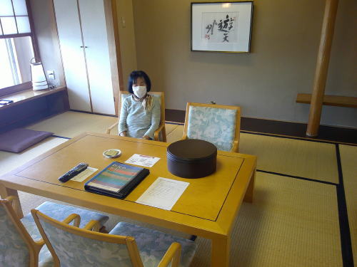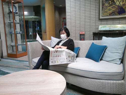 | 受付待ち時間、ホテルロビーにて | 受付が混んでいるためロビーで待っているところ | |