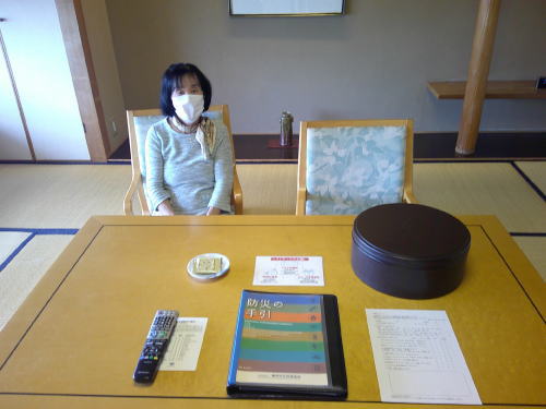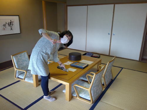 | 412号室部屋8畳ほどの和室とベランダあり | 部屋には一般的なお茶セットなどがあり | |