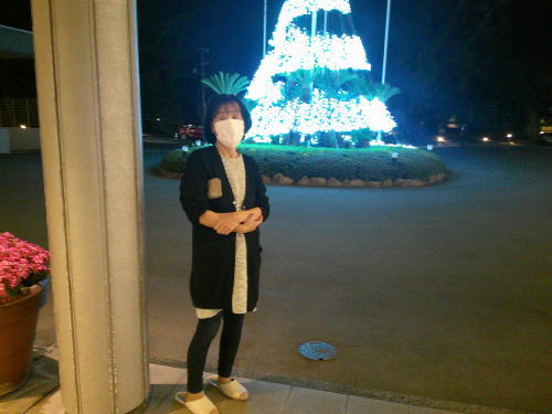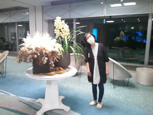 | 玄関の前にはクリスマスを象ったイルミネーションがあり記念撮影 | 1階ロビーにあるお花の前で | |