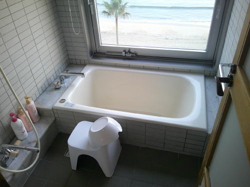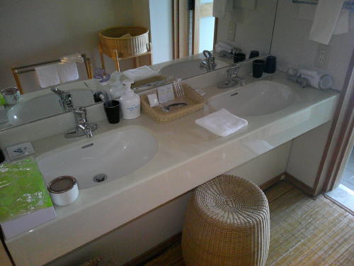 | 部屋の備え付けてあるお風呂、便所と風呂は別々の部屋にあり | 部屋にある洗面所、DHCのホテルだけあって化粧品はそろっている | |