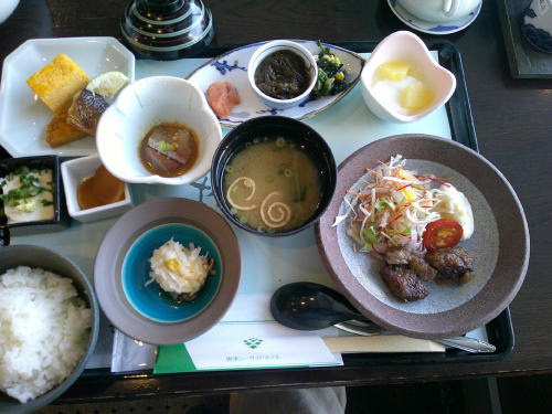 | 朝食は松月で会員割引では月波櫓のバイキングは利用できなかった | 朝食はカンパチのたれ付け、佐賀牛、サバの焼き魚、シュウマイ等とくに美味しかったのがカンパチの茶漬け |