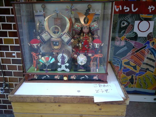 | 朝市通り月曜日であったためか人の通りは少なかった | 朝市通りの中には五月人形が無料で持っていけの置物がありびっくり | |