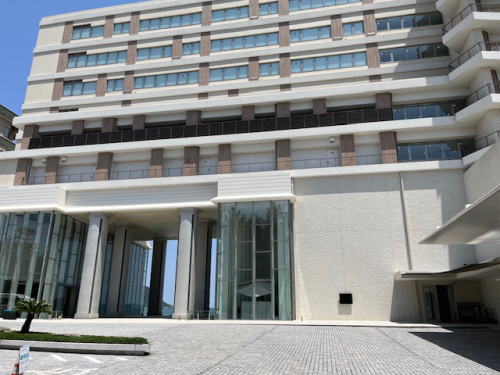 | ホテルの経営は栄町の前DHC経営吉田氏からお菓子のシャトリーゼに | 唐津シーサイドホテル東館の前で記念撮影 | |