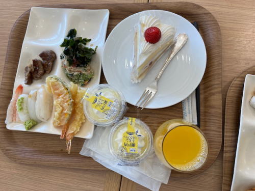 | バイキング形式、1人1,700円で50種類ほどのメニューがある。写真はエビとかぼちゃの天ぷら、ステーキ肉、いか・エビの寿司、ぷりん・ケーキなど | ||