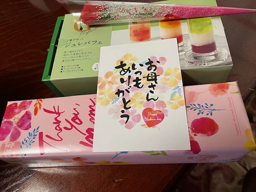 | 茂彦・かおりさんから母の日プレゼント | カステラとジュレパフェ、カーネーションと手紙が入っていました | |