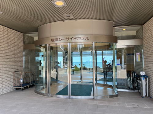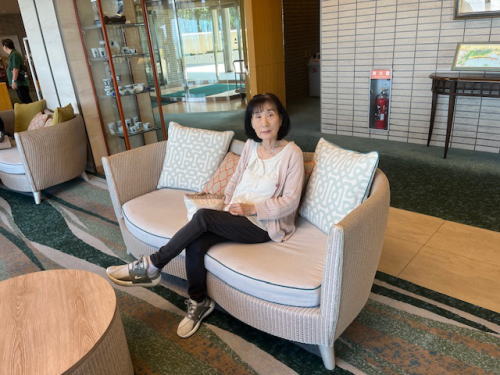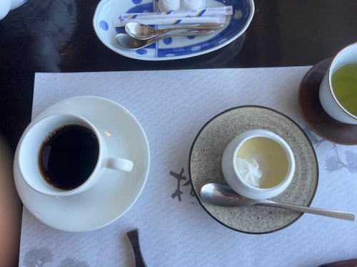 | シーサイドホテルのフロントで記念撮影 | デザートはホイップクリームの入った水羊羹とホットコーヒー | |