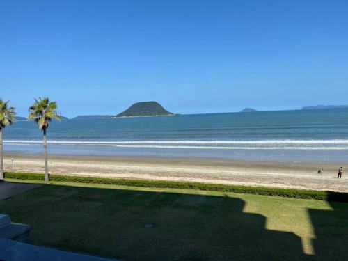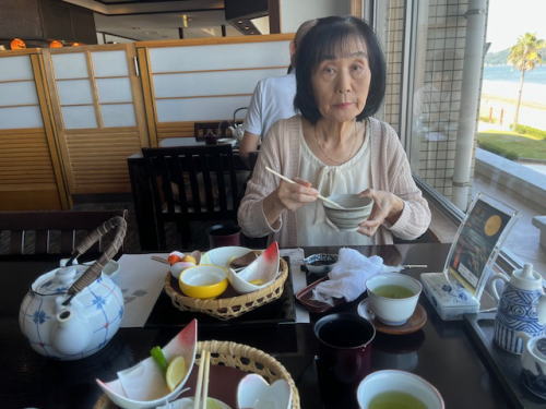| 智子73歳の誕生日を記念してシーサイドホテルで食事会を | 東館2階の松風から高島方面を眺めたもの。空も真っ青に晴れてい抜群の景色 | |