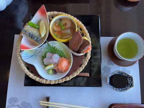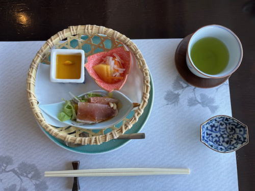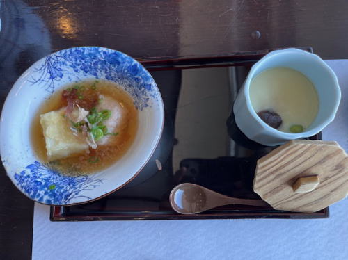 | コース料理の花籠会席をいただくことに。1人3000円でシニアは2700円。 | コース料理の2番目に出てくる料理で蓋物と茶碗蒸し | |