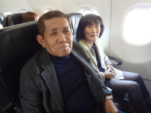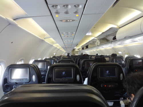 | 飛行機内でキャビンアテンダントの方に撮影してもらう | 飛行機内部 3列座席で今回は2人だけで座ることができた。飛行機の出発時間は14時20分 | |