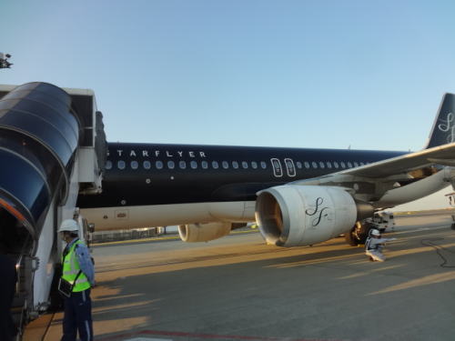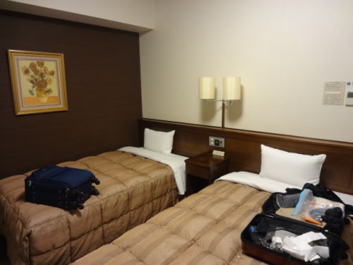 | 東京行きに利用したSFJ(スターフライヤージェット)外観は黒色 | ホテルルートイン 部屋はツインで広さ的にも余裕あり (421号室) | |
