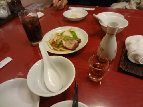 | 食事が来る前に記念撮影 | コース料理でスープの後に出てきたのが北京ダック ドリンクは紹興酒とコーラー | |
