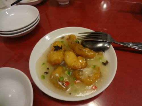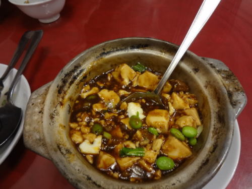 | 白身魚のあんかけ。他にもチャーハンや杏仁豆腐などもあり | 麻婆豆腐。このころになるとお腹のほうが満杯に | |