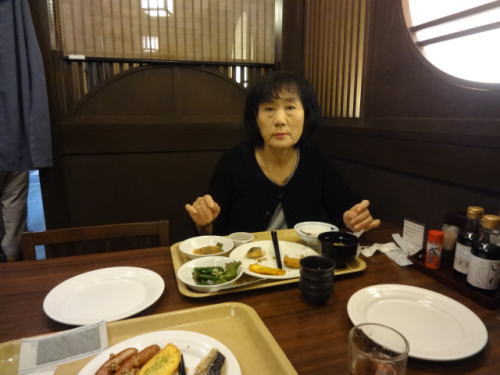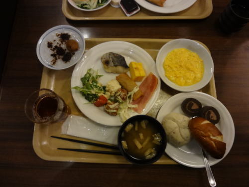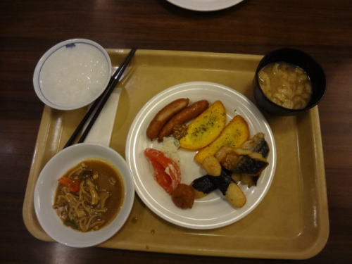 | 2日目の朝 ホテルルートインの朝食 バイキング形式で卵エッグや春巻きなど | 2日目のルートインホテルの朝食 個室でいただきました | |