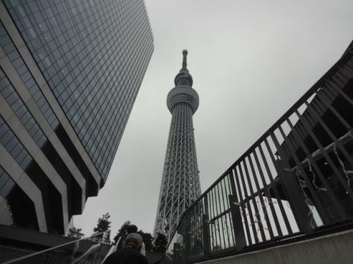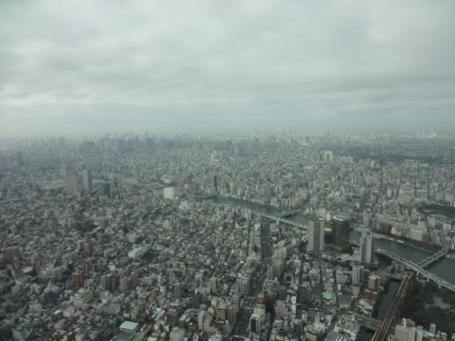 | スカイツリー 登場口へ行く途中に撮影 スカイツリー入場券は2,060円/大人 | 展望デッキ350mより撮影 中央に見える川が隅田川 | |