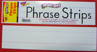 | フレーズストリップ(白) 1,200円 30枚入り(30.5x7.6 cm) 水性マーカーやクレヨンの使用で繰り返しつかえるワイプオフタイプのストリップです。ガイドラインが入っていて高さ1.5インチ(3.81cm)の文字が書けます。3色入りのものと合わせてお使いいただくと文法の説明などに便利です。在庫無し |