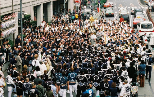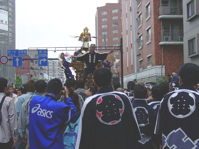 | 今にも雨が降り出しそうな空模様でしたが、三北神輿は担ぎ手と見物人との熱気の中花やしき通りへ進んでいきます。 | |