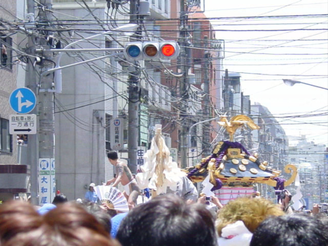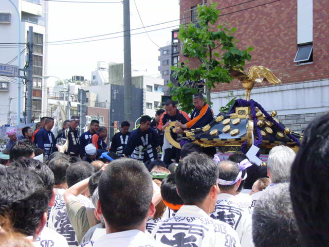 | ガソリンスタンド手前で中村会から丸金へ。言問通りに出たら私も担ぎに入ろうと何度もチャレンジしたけど、なかなか入れない!ていうか転ばないよう、つぶされないよう踏ん張るのが精一杯。一部小競り合いが発生してもみ合ってる固まりが横にそれていったら、腕組みしたチョッキ隊がどどーっと入ってきた。そういうのどこで練習すんの?ガッチリ腕組んじゃってキモイ〜でもそれ違うところでやったら、うけるで。(爆) |
