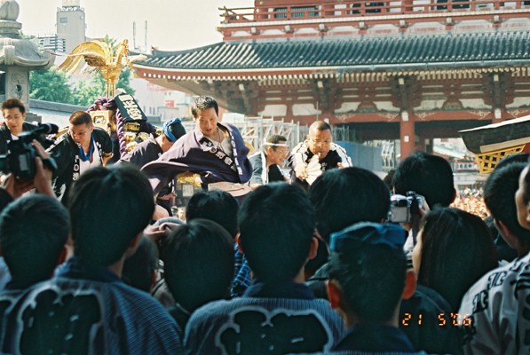 | ホントはね〜宮出しも見物やめようかと思っていたんだけど、宵の宮パスしたしってことで、起きちゃいました3時半過ぎに。でも家出たのは5時過ぎ・・・んー遅いかしら? 浅草に着いたのは7時少し前。小走りに入場口へ。なんとなく、去年よりバリケードが薄い?って気がしたけど違うかな?入り口で『担ぎ手ですか?』って聞かれて『はい、そうです』って。カメラ2台ぶら下げて。ヘ(^o^)/ 入ったら、居た居た丸金部隊。ということで間に合ったわけよ。ホッとしている間はなく、撮影に安全な場所探し。ウロウロしていたら、本堂前に行ける通路を発見!どこぞのお兄さんたちにくっついて、くぐり抜けようとしたら、お兄さんがちょっと助けてくれました。謝謝。初めて宮出しで本堂の階段の所に行けました。近くに丸金、浅香の役員さんがいらっしゃいました。確実に安全地帯ってことかな?(o^^o) |