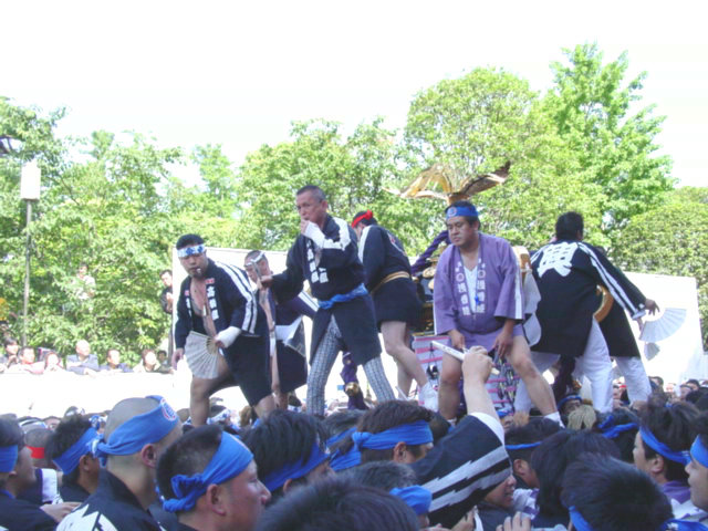 | 本堂前を通過するのと同時に、役員さんたちも本堂から出ていったので、私もしっかり着いて行きました。本堂横まで先回りしたら、なにやら人垣が?!のぞいたらプルプルして倒れている男の人が。ありゃ?つぶされちゃった?警官隊に運ばれて行きましたが・・・あとで確認したらケンカかららしいですが、倒れた拍子に脳しんとうを起こしていたらしいです。リアルに目撃してしまってちょっとビックリしました。。。(@_@) | |