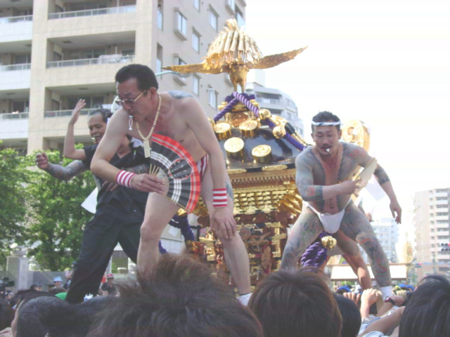 | 2日間とも天気に恵まれ、(ていうか暑かったし!)宮渡御でもそれほどイライラしなかったからでしょう、近年にはめずらしく 『楽しかった〜!!』て心底思える三社祭でした。ほとんどの人が1年ぶりの再会ばっかりだけど、また来年同じ顔ぶれに会いたいですね!みんな仲間ですからね!残念な話も耳にしましたが、その人の思いを受け継いでこれからも伝統を守って祭りに臨みたいです。見ている人には『去年と変わらなくて無くて面白くない』って思われる部分もあるでしょうが、『変わらない』ってことはホントは大変なんですよね。そこにいろんな人の努力があるわけですから。来年も変わらないメンバーに会えることを願っています。 そして今年も楽しい時間をありがとう!ホント回る三北神輿って楽しかったわ! ありがとうございました〜!明日からどーしよ・・・(~o~) |