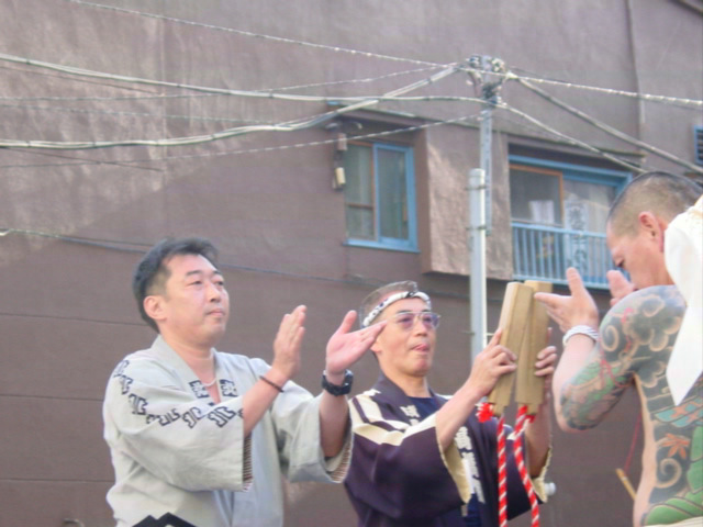 | ようやく?言問通りに入って、高橋さんのところで差し上げて、いつもの雰囲気に戻ったみたいでした。やっぱり三北の町会渡御が一番楽しいね!だんだん終わりが近くなってくると、神輿も進まなくなる。名残惜しいからね。 | |