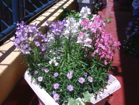 一番良い時期に水切れで枯れかけたハンギングバスケットです。なんとか持ちこたえてくれましたが少々傷んでいます。(特にデージー) 両側面のロベリア(白)はこれから咲きそう。 側面に植えるタイプでの初チャレンジ作品です。写真がイマイチですね(^_^; サクラソウ(プリムラ・マラコイデス)、ビオラ、パンジー、ブラキカム、パコバ、 デージー、ロベリア |