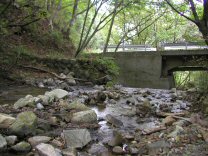 甘酒茶屋跡からの県道は、九十九折を繰り返しながら緩やかに下ってゆく。相変わらず車も通らないし、人にも出会わない。バイクが4、5台集団で下ってゆくのに出会ったくらいである。このような道を30分くらい歩いて、清水橋に出た。ここに、先ほどの峠道の入口に合ったのと同じ道標が立っていた。いやな予感がしたので、案内板を読んでみると、やはり先ほどの峠道がここまで続いているようである。昭和62年に、ここ清水橋から峠まで荒れていた旧道を整備して歩行のできるようにしたのだという。甘酒茶屋のところで道は途切れたいたはずだが・・・。もう一度戻ってこの峠道を全部歩きとおすか、それともこのまま先に進むか、ここは思案のしどころである。時計を見るとちょうど12時。清水橋の下の川辺にちょうどよい場所があるので、ここで昼食にして、ゆっくりと考えることにした。