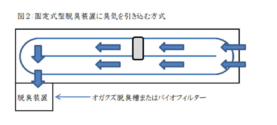 ロータリー式コンポの消臭対策」 今回は読者さんから頂いた質問をテーマにしました。 私が20年間勤務した養豚場でもロータリー式コンポを使っていましたので、臭い対策には苦労しました。 結論から申しますと、全く臭いが出ない様にすることはまず不可能ですから、 どのくらい臭いを抑えれば苦情が来ないレベルになるかを考えるしかありません。 そのためには臭いの発生自体を少なくする対策と、発生した臭いを脱臭する対策の両面からのアプローチが必要です。 まず、臭いの発生自体を少なくする対策ですが、悪臭を発生するのは嫌気性菌が活動して、 たんぱく質やアミノ酸を分解してアンモニアを生成するからであり、悪臭発生を抑えるには嫌気性発酵をさせないことが重要です。 つまり、豚舎は糞尿分離式の方が良いわけです。 そして糞は豚舎に長時間ためておくと嫌気性発酵が始まるので、1日2回ぐらいの間隔でスクレーパーを動かして除糞することも大切です。 もうひとつは、生菌剤を飼料に添加したり、飲水添加したりして与えることも有効です。 悪臭を発生する菌は俗に悪玉菌と呼ばれるものが多いので、豚の腸内からも善玉菌を優性の状態にしてやることが、 豚の健康にも糞からの悪臭低減にも役立つわけです。 消臭効果がある生菌剤は多種類発売されていますから、どれが良いとは一口には言い切れませんが、 私の経験上ではEM菌が最も費用対効果がありました。それは原液のまま使用するのではなく、自家培養して100倍に増やして使えるからです。 培養の方法は今回の紙面の都合上、割愛させていただきます。 飲水添加器を使えば培養液を補充するだけなので労力も少なくて済みます。 飼料添加するタイプの生菌剤は、バルク車に投入して混ぜれば労力は省けますが、コストは高くなる場合が多いです。 次に、コンポストから発生した臭いを脱臭する対策です。 設備投資をせずにできる方法としては、堆積している堆肥の上から消臭剤や生菌剤を散布する方法もありますが、 労力がかかる割に効果の面では今ひとつです。 コンポが止まっているときは臭いが抑えられますが、コンポが作動して攪拌中には、かなりの臭いが出てしまいます。 その次に低予算でできる消臭方法が、攪拌機に小型脱臭装置を取り付ける方法です。 図1がその模式図です。攪拌機のメーカーによっては、オプションとしてこのような脱臭装置をラインナップしているところもあります。 このタイプの脱臭装置もメーカーによって脱臭方式に差異があります。 図1に示した方式はスクラバー方式と言います。 プラスチックのドラム缶のような容器の中で消臭液をシャワーリングして、そこに攪拌機から吸い込んだ臭気を通すことで消臭します。 消臭液は真水でもアンモニアはある程度吸着できますが、酢酸やギ酸など、酸性の水溶液を使用すると脱臭効果が高まります。 この方式の欠点は、攪拌によって発生した臭気を100%吸い込むことはできないことです。攪拌機が通過した後でもしばらくは堆肥から臭気が湧き上がるからです。 もう一つ、攪拌機が乾燥した堆肥の部分を通過するとホコリが舞い上がり、 それが脱臭装置の吸気フィルターに詰まったり、消臭液散布のズルが詰まったりすることです。 また、消臭液も毎日〜数日ごとに交換しないと消臭効果が落ちます。 さらなる消臭効果と労力軽減を求めるならば、コンポストの建物全体を密閉して、脱臭装置に吸い込んで消臭する方式にします。 (図2参照) この方式では、脱臭装置の入り口にファンやブロワーを設置して臭気を吸い込みますが、それだけではうまく臭気が集まりません。 図2の矢印のように順送ファンを取り付けて空気の流れを作ってやることが必要です。 オガコ式脱臭槽を使う場合は、空調用のファンでは圧力が足りませんので、リングブロワーを使う必要があります。 この方式ではコストは安く済みますが、風量を多くすることが難しいので、比較的容積の小さい発酵ハウス向きです。 700〜800平方メートル以上の大型発酵ハウスの場合はバイオフィルター方式にしたほうが十分な脱臭効果が得られます。 ただし、バイオフィルター方式でもホコリによる目詰まりは発生します。 定期的にフィルターを高圧洗浄機で洗浄する必要があります。 その間隔はホコリの発生状況にもよりますが1〜3週間に1度は必要です。