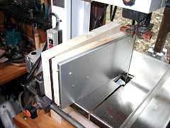 これがバンドソー用のリップフェンスです。2x6を蝶番でつないで、アルミの板をつけています。アルミは主に摺動抵抗を減らすためにつけました。、、、もっとも、アルミは工場の廃材ですが、、(