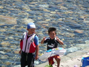 本当に銚子川は綺麗です。常に川底の石が見えます。鮎が泳ぐ姿もまる見えです来年は水中カメラを持参したくなります。ちょっと大きく目立ってしまうのが。。。子供は朝から川に入り魚とり。流れを見ながらライフジャケット着用するよう指導していますが。。。潜れなくなるので嫌がる子供。安全に留意しながら着用が必要ですね!! |