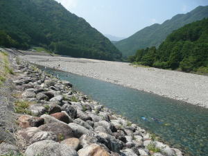 『遊びの達人』川で自然体験 子供の頃、小学校や子ども会で付知峡の川で遊んだことを思い出す。川べりで石を投げたり、ちょっと川に入ったらズックを片方流されてしまったりという経験はあるのだけれど、川に飛び込んで遊んだり、魚を獲ったりしたことは無い。銚子川の子供たちは川に飛び込んで、思い思いに流れている。ただ流れる子もいれば、水中メガネとシュノーケルをつけて、川の中を見ながら流れている子もいる。川は危ないところだと思っている人は多いと思うが、ほんとうは「川には危ないところもある」が、そのことをわかって遊べば、こんなに面白いところは無いのだ。ライフジャケットと水中メガネにシュノーケルで、川の中を覗きながら、時にはもぐって魚を探し、棒の先にくし型の金具がついた「ヤス」という道具で魚を突く。子供は、確実に川ガキになっていっている。僕も遅ればせながら川ガキになりつつあるような気がする。一緒に川に入っているときは、大人も子供も無いもんだ。 |