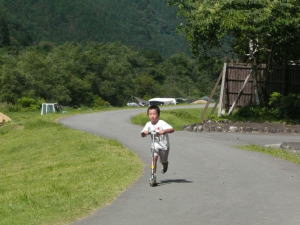 ちょっとした遊具広場と水遊び場(夏休み限定)がありますが、一日中遊ぶにはちょっと物足りないかなぁ?キックスケーターを借りて遊んでいました。温泉が無料で入浴できるので、汗を掻いては入浴、暇つぶしに入浴、酔い覚ましに入浴、目覚ましに朝風呂と温泉三昧なパパでした。 |