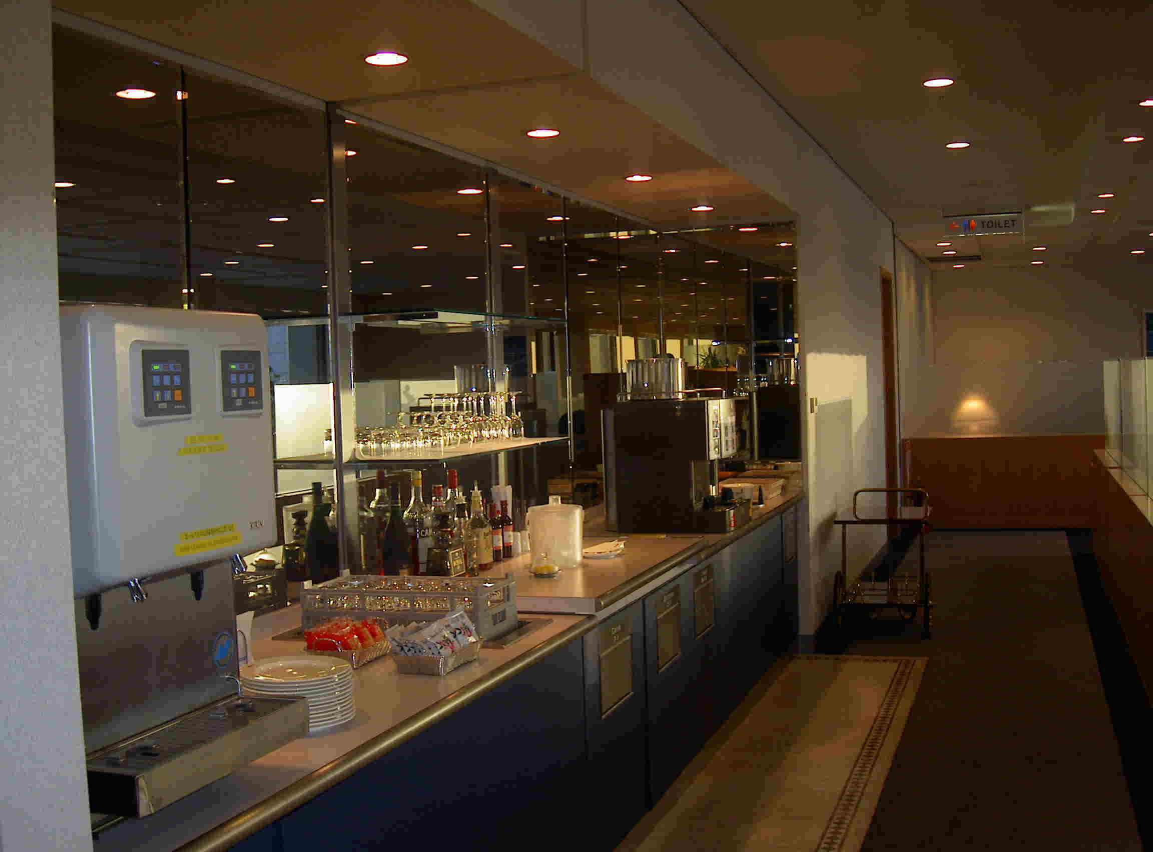 | 全日空のラウンジの入り口 | ラウンジ内のバー(セルフサービス) ほとんどの種類のアルコールやソフトドリンクがある |