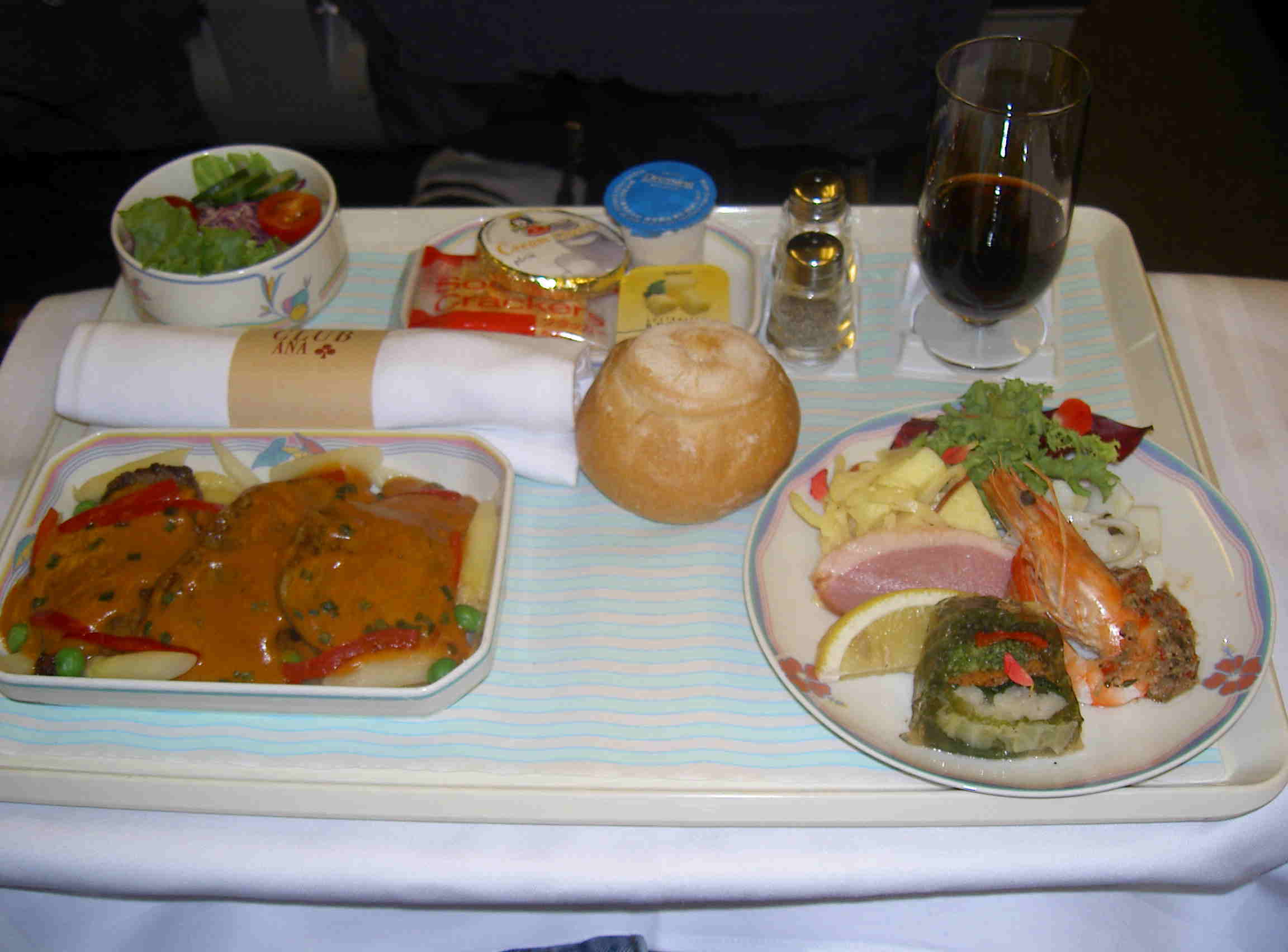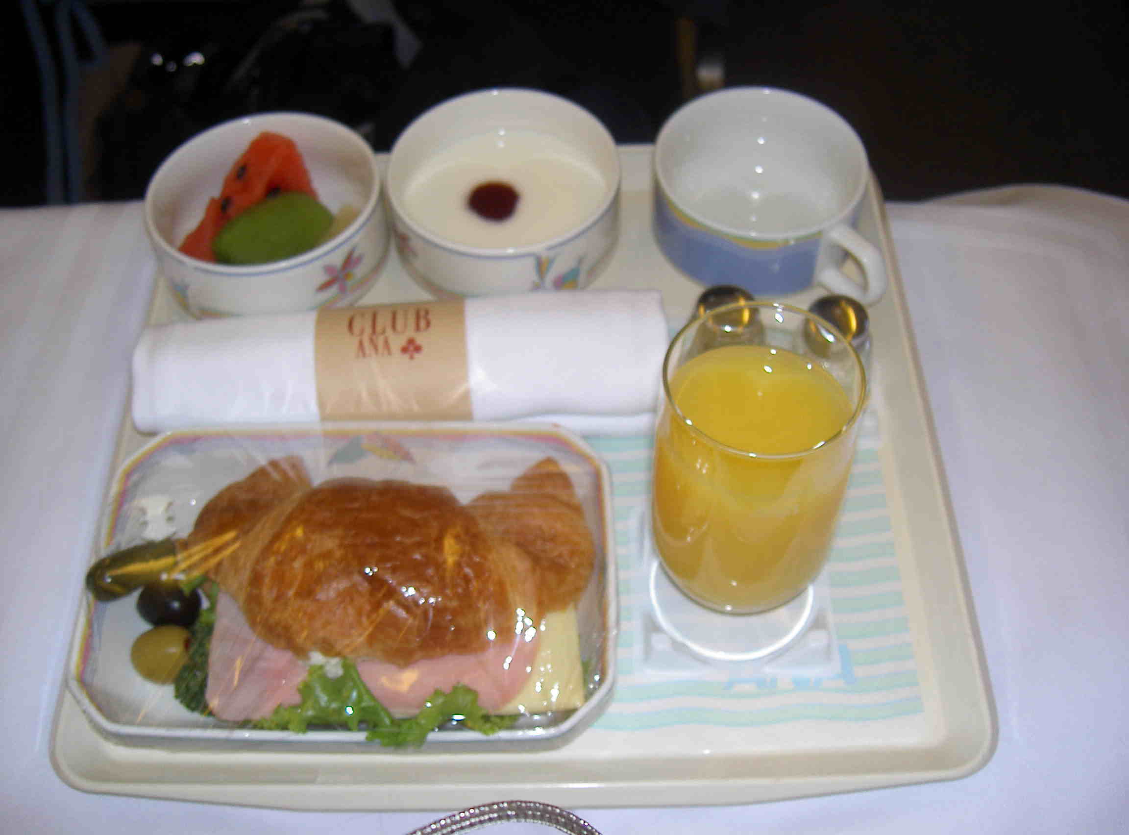 機内に入ると早速スチュワーデスに入国カードと税関申告書を持ってきてもらう。こいつを書かなきゃゆっくり酒が飲めない。入国カードを書き上げた頃に離陸。水平飛行に入ると食事の準備が始まる。もう21時前。腹減ったよー!旅慣れている人は時差ぼけを少なくするため、飛行機に乗る前から生活のリズムを到着地の時差に合わせるという。ハワイに行く場合、飛行機に乗る前に夕食をとっておき、搭乗後は何も食べずにひたすら寝るのが時差ぼけを少なくする最良の方法。日本時間の21時はハワイでは夜中の1時。ハワイ時間に合わせるのならこの時間は寝ていなければならない!でも、機内の食事も旅の楽しみの一つ。食事をせずに、寝るなんてせこい僕にできるはずがない。