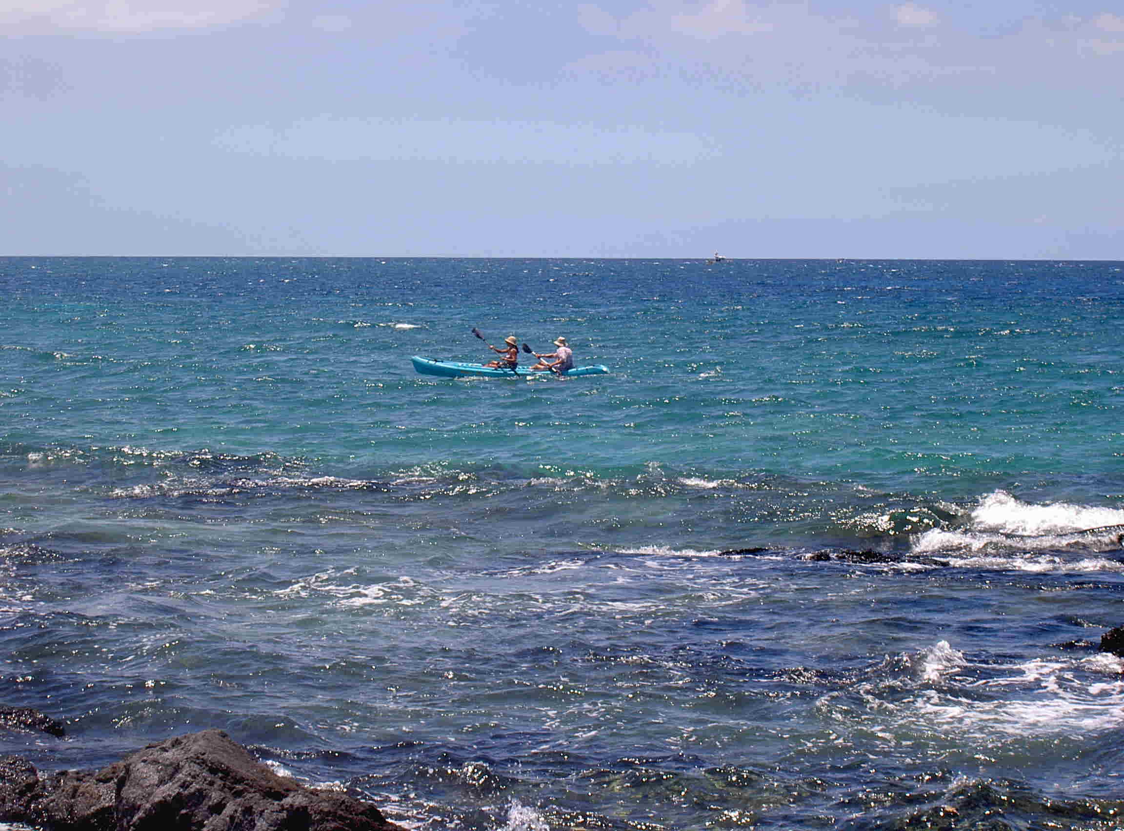 まず、ワイコロアビーチドライブ沿いに、あっちにぶらりこっちにぶらりという感じでうろうろする。高級コンドミニアムやゴルフ場のクラブハウスを見て回る。ゴルフコースと遊歩道の区別がはっきりしていないので、うっかりするとゴルフコースに自転車が入ってしまう。暑いけど空気が乾燥していて気持ちがいい。ゆっくりと移動したけど1時間ほどでリゾート内を1周する。マウラナニリゾートより一回り小さい。ヒルトンワイコロアとアウトリガーの間の海岸に自転車で乗り入れる。溶岩と珊瑚の海岸で砂はない。水は驚くほどきれいだ。沖合をヨットやカヤックがのんびりと航行する。アウトリガーの中をぬけて、今度はワイコロアビーチに行く。ここでは今はやりのカイトサーフイング?をしていた。