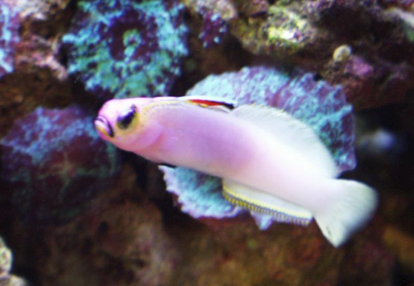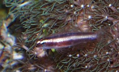 強く紫色を帯びる。特に吻端は頭と同じ紫。また、体長はアケボノハゼより長く大型のNemateleotris