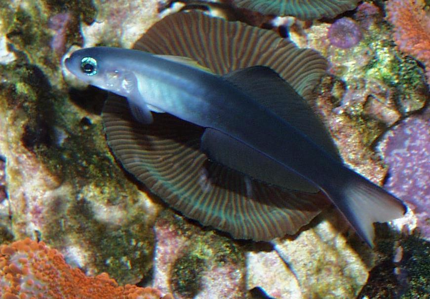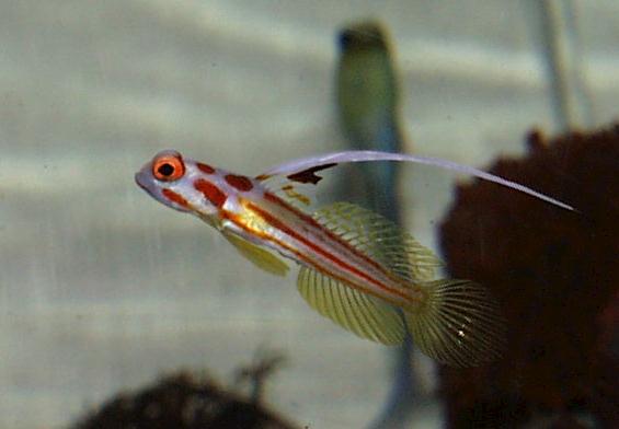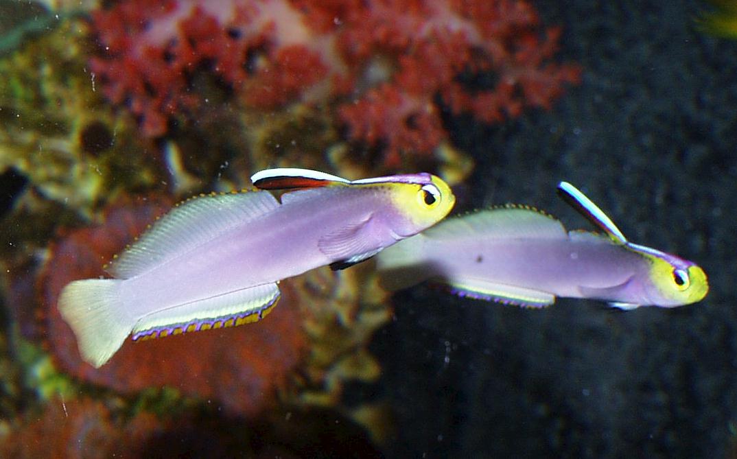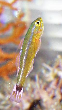 下はノーマルタイプのパープルファイアーゴビーで上のものより小さくハタタテハゼぐらい。頭部の紫と吻端の黄色が明瞭に区別される。頬部もはるかに黄色が広い。よく似た別種のような気がするが、下は上の幼魚との説もある。長期間飼育できれば、その答えが明らかになると思う。上はこの大きさのままで、1年半になる。