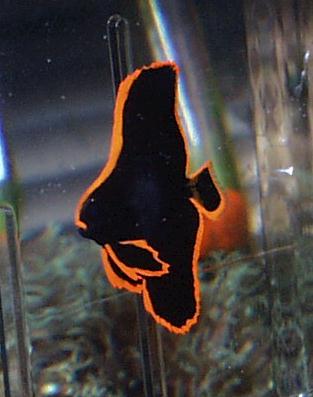 成魚はツバメウオによく似ていて、銀色の丸いエンゼルフッシュ型の魚であるが、幼魚は全く違う体色・体型で、オレンジで体周を「くくられた」黒色の魚である。これはよく似た配色の有毒のヒラムシがいて、それへの擬態と言われてきたが、普通入荷するアカククリの幼魚は上下15cmもあり、1〜2cmのヒラムシとのあまりの大きさの違いから、擬態説には疑問があったが、今回2cm弱の極小幼魚を見て、確かに擬態しているかも知れないと思った。
