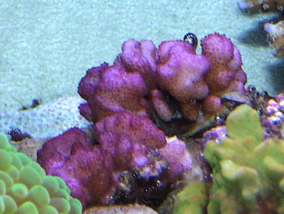 同じハナヤサイでもこの小ハナヤサイは、どんなに光が強くても大丈夫でした。「でした」というのは3個の小ハナヤサイピンクのうち、この個体は貝に落とされて、98年11月28日、オオハナガタサンゴに溶かされてしまったのです。ああ、パテで固定しとけば良かった。(ホームページ作成中に遺影となってしまいました。)