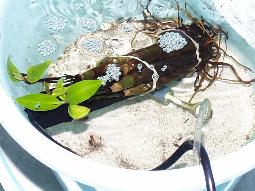 ライブサンドをひいた場合どのくらいの深さで硫化水素発生が始まるか、また、水質への影響を見るためにバケツにライブサンドを入れ、エアーレイションのみで、変化を観察しました。