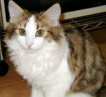 党員149番・ぽんちゃんです。鮮やかな「黒・白・赤」の三毛であることがおわかりいただけると思います。コントラストがとても美しいですね。 もうひとつの三毛パターンに「茶・白・赤」があります。ここで注意していただきたいのは、茶色の部分には通常かならずシマシマが出ることです。たとえばこのような感じになります。